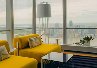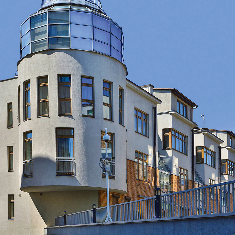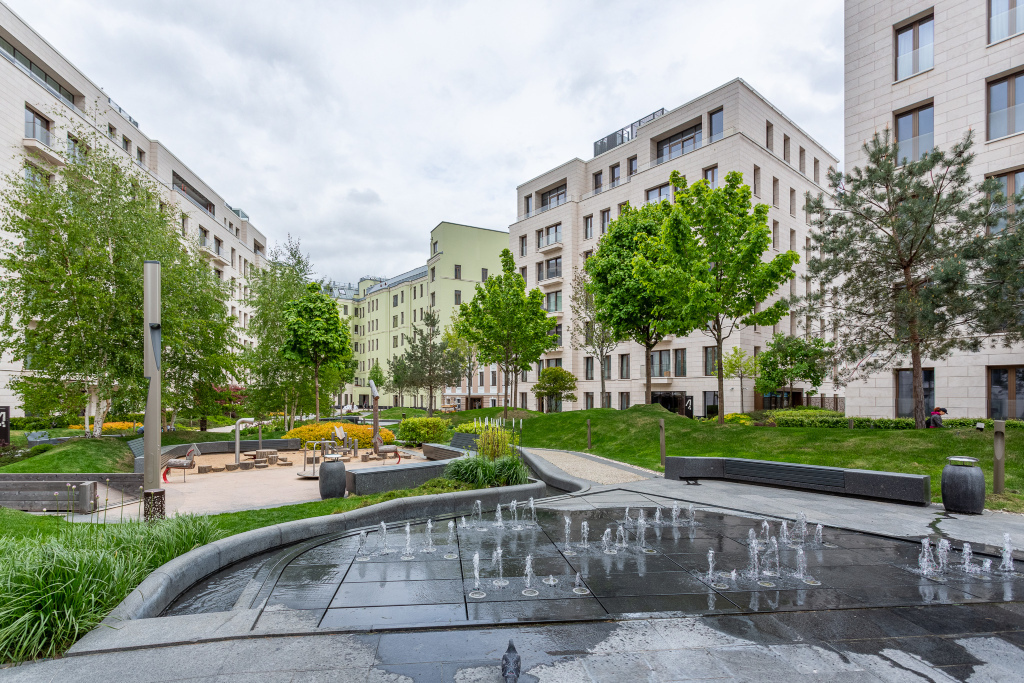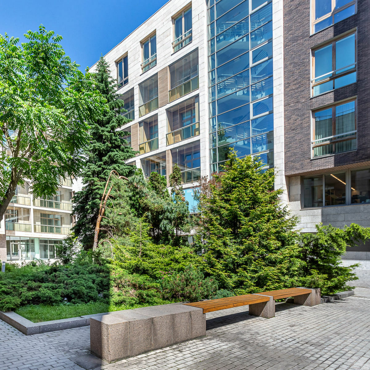 Первые этажи занимают лобби с консьержем. Современные бесшумные лифты OTIS не потревожат вас и соседей. В комплексе работает многоуровневая охрана — контрольно-пропускной пункт, видеонаблюдение по периметру позволит не беспокоиться за свою безопасность. Выход из общих холлов ведет во внутренний двор, где среди пышной зелени деревьев и кустарников оборудованы зоны отдыха и детская площадка. Паркинг с автомойкой размещен в подземной части дома.